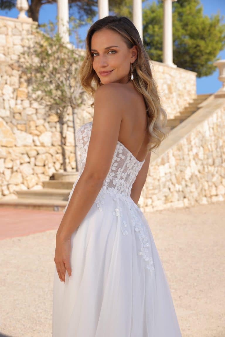 De Aleida trouwjurk is een droom voor elke bruid die houdt van een vleugje glamour op haar trouwdag. De jurk heeft een betoverende sweetheart halslijn die prachtig is versierd met kralen, wat een subtiele glinstering toevoegt aan het geheel. Het korset lijfje zorgt voor een perfecte pasvorm en accentueert de taille van de bruid op een elegante manier. De gedetailleerde kantapplicaties op het lijfje geven de jurk een verfijnde en romantische uitstraling. De sparkle tule rok met een split voegt een speelse en moderne touch toe, waardoor de jurk zowel elegant als verleidelijk is. De vloeiende rok zorgt ervoor dat de bruid zich moeiteloos kan bewegen, wat ideaal is voor dansen en rondlopen op de grote dag. De Aleida is perfect voor de moderne bruid die op zoek is naar een combinatie van klassieke elegantie en een glamoureuze flair.