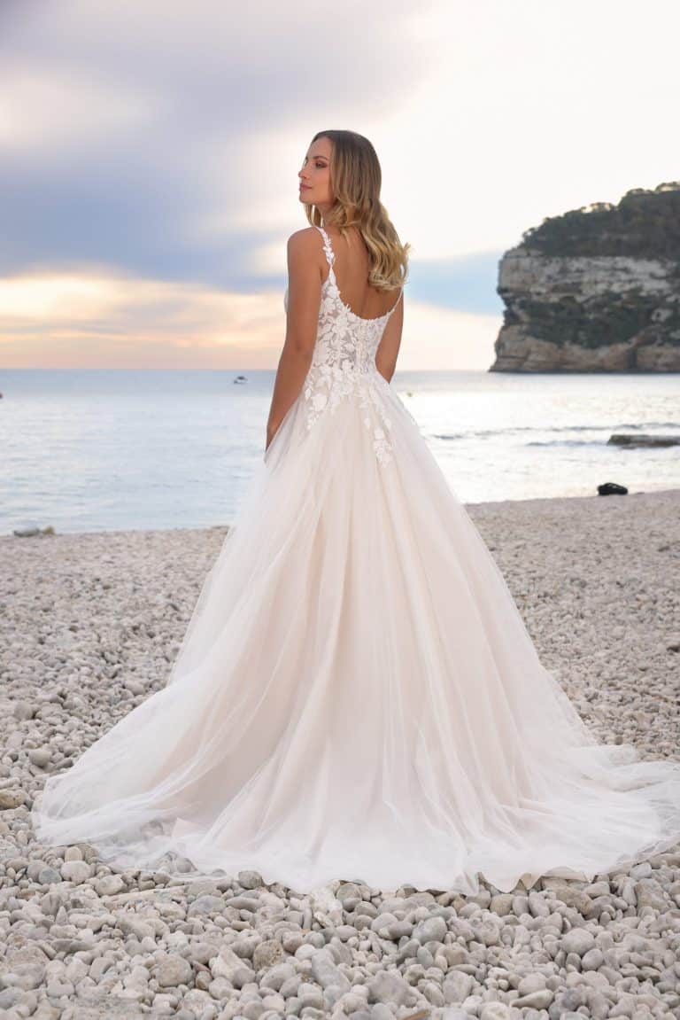 Bahar is een moderne klassieker met een vleugje dromerigheid. De diepe V-hals met illusion tule biedt ondersteuning zonder in te leveren op verfijning, terwijl de 3D-bloemenapplicaties in ivoor en poederroze subtiel over het lijfje en de taille dansen. De luchtige tule rok valt sierlijk over de heupen en beweegt lichtjes mee bij elke stap. De lage rug met smalle bandjes en korset-look voegt een vleugje sensualiteit toe. Bahar is perfect voor de bruid die elegantie zoekt met een romantische twist.