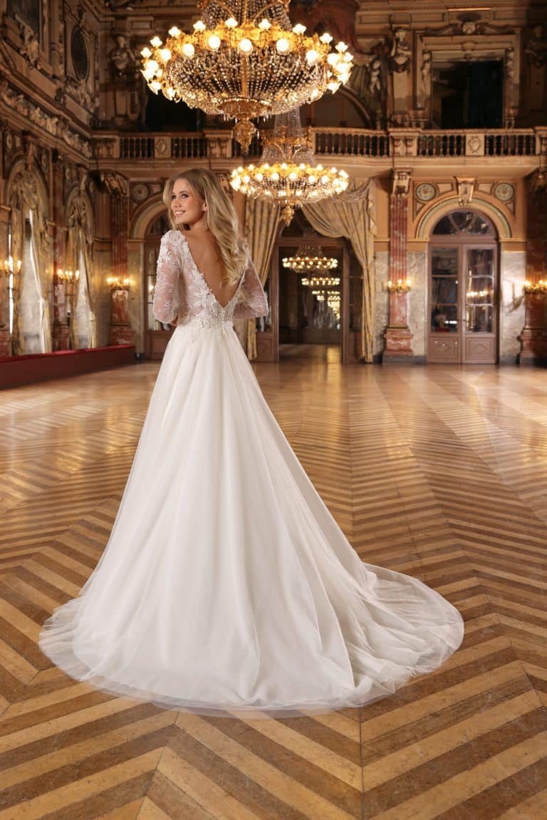 Met haar diepe V-halslijn, illusion rug en lange kanten mouwen is Bernou de belichaming van klassieke elegantie in een moderne vorm. De top is rijkelijk versierd met verfijnd kant en subtiele glinstering, die naadloos overloopt in een zachte tule rok die luchtig meebeweegt bij elke stap. De diepe rug en transparante mouwen zorgen voor een sensueel maar sophisticated silhouet. Deze jurk past perfect binnen de bridal trends, waar romantisch kant, zachte volumes en delicate details centraal staan. Bernou is ideaal voor bruiden die dromen van een sprookjesachtige look met een modieuze twist.
