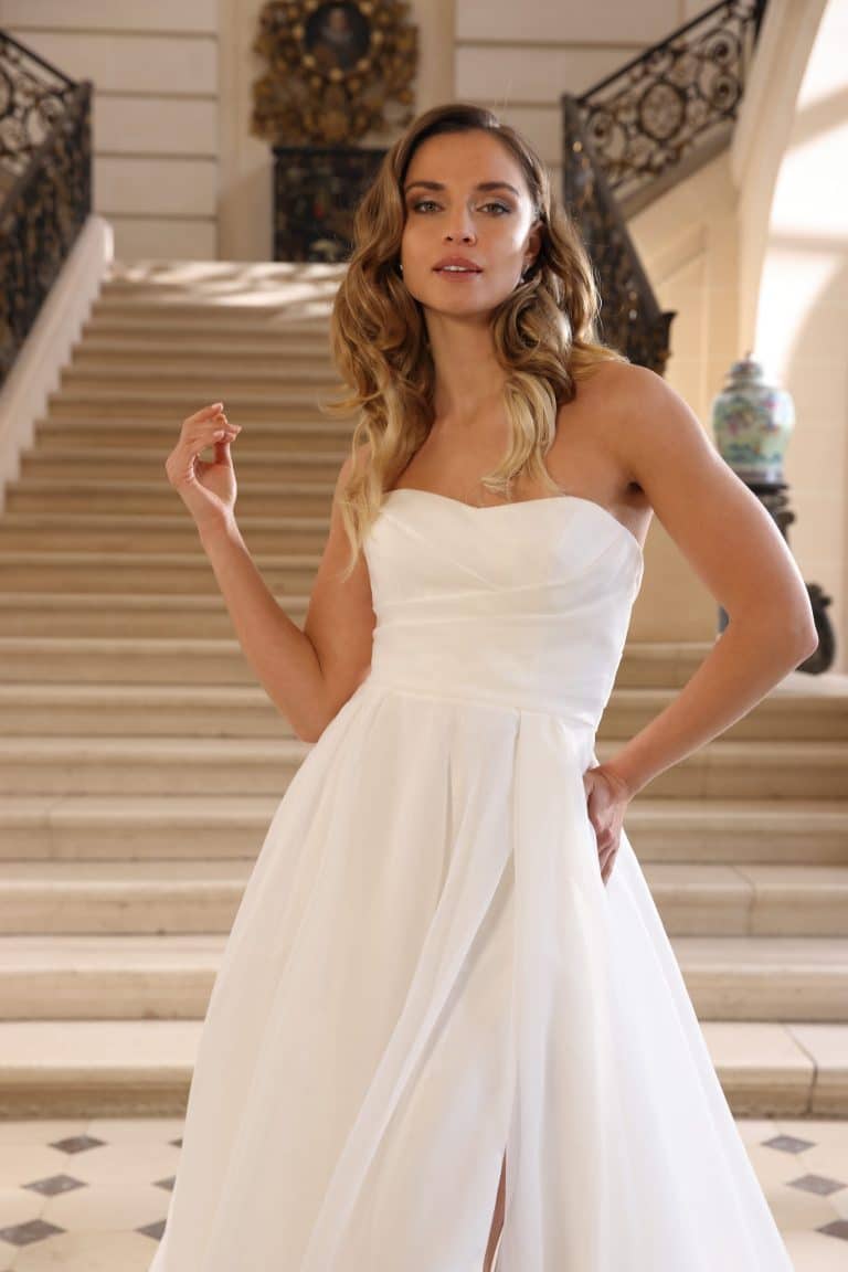 Voor de bruid die houdt van less is more, is trouwjurk Blue de ultieme keuze. Deze strapless beauty combineert een klassiek, clean silhouet met moderne details zoals de hoge split in de rok en verborgen zakken – praktisch én stijlvol. De lichte organza stof zorgt voor een zwevend effect bij elke stap, terwijl het geplooide lijfje subtiel vormgeeft aan het bovenlichaam. Of je nu kiest voor een bruiloft in een chique locatie of een stijlvolle buitenlocatie, Blue brengt moeiteloos elegantie en attitude samen. Minimalistisch, sensueel en krachtig vrouwelijk – perfect voor de bruid die durft op te vallen in haar eenvoud.